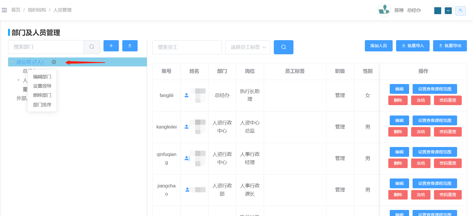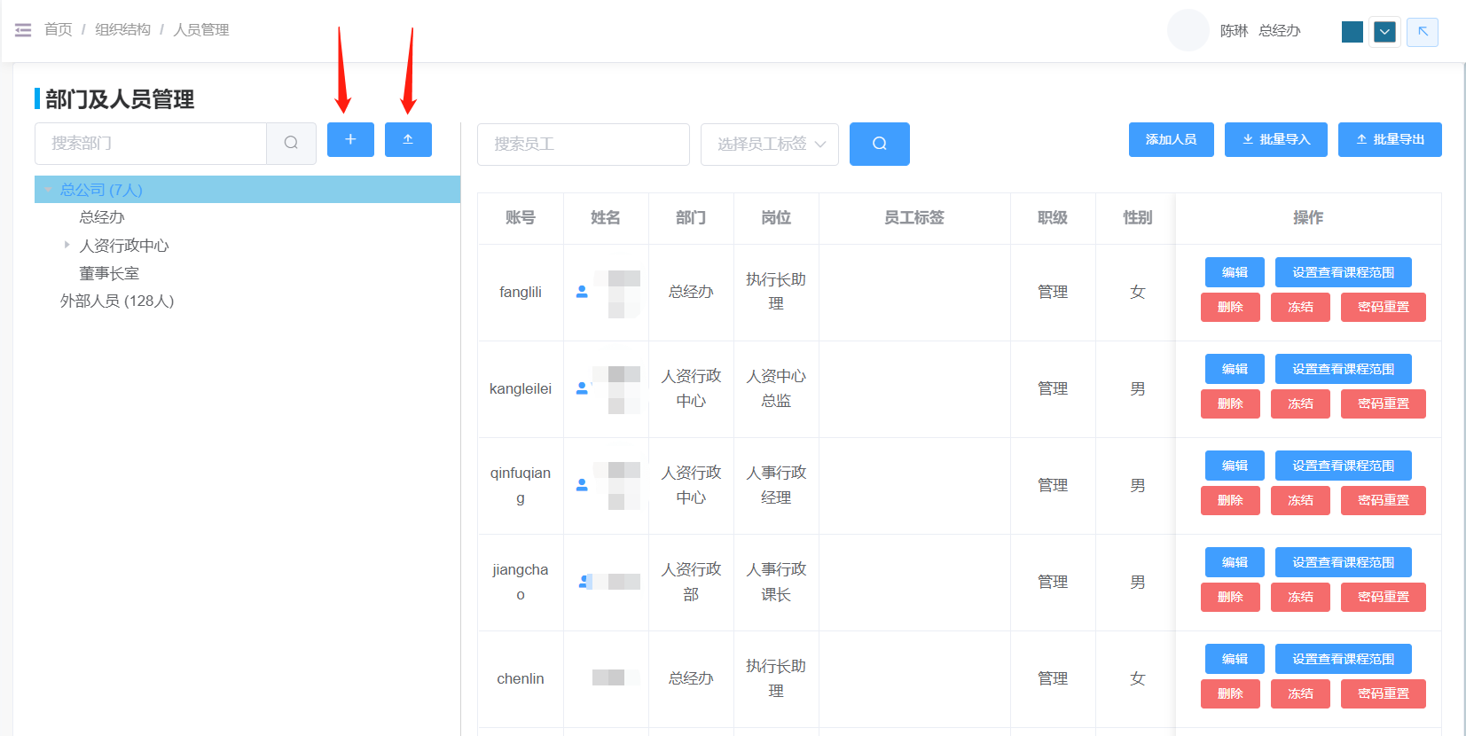 2. 部门管理新建组织结构时,在部门和人员管理中,点击组织树上的“+”,新建部门。新建部门右侧的图标,是批量上传部门,按照模板要求填写部门信息,可批量上传部门。 对已经建立好的部门进行修改,将鼠标放在部门名称上,点击右侧出现的工具图标,就可以对部门进行修改和删除。 作者:chenlin 创建时间:2022-10-04 21:52最后编辑:chenlin 更新时间:2023-10-08 08:41
